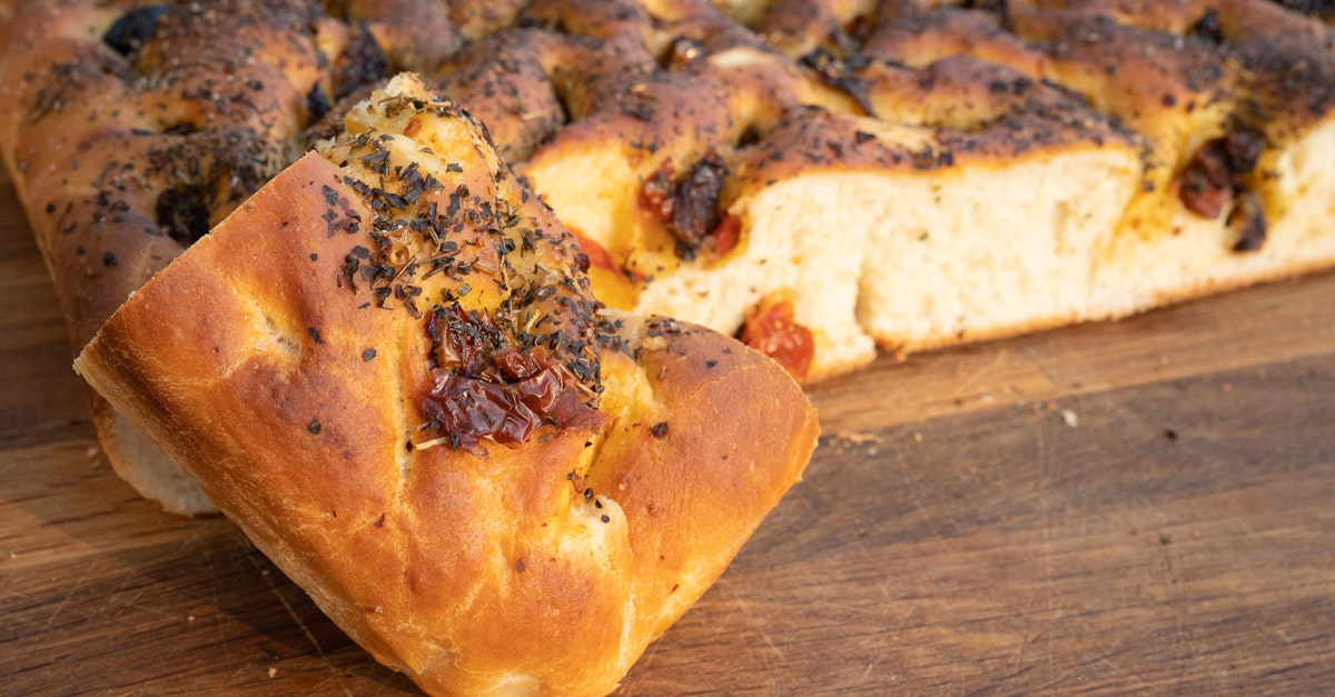 - Druk de olijven en tomaten nu met je vingers tot beneden in het deeg. Je mag ook gewoon een beetje met je vingertoppen in het deeg duwen totdat je de bakplaat voelt. (Dit zorgt voor de typische structuur van de foccaia, en voorkomt dat de tomaten aanbranden.)
