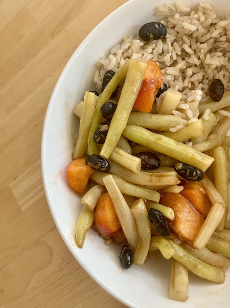 - Giet de boontjes af, laat uitdruppen en doe bij de abrikozen.